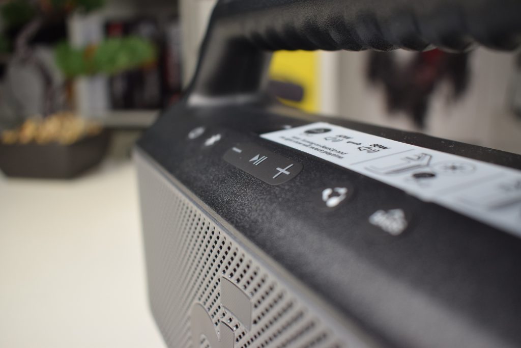Oben befinden sich alle wichtigen Tasten: Power, Bluetooth, Lautstärke, Play/Pause und die spezielle BassUp-Taste. Die Knöpfe haben einen guten Druckpunkt und reagieren schnell.